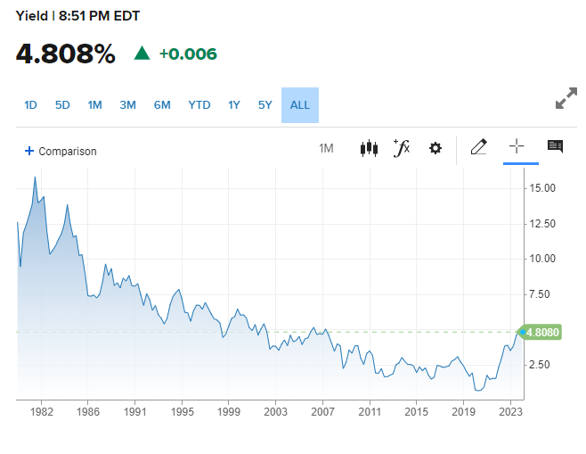五年期和十年期美國公債的殖利率,以及三十年期公債殖利率,同時都達到了自2007年以來的最高點。十年期國債的收益率於週二達到4.8%(下圖)。