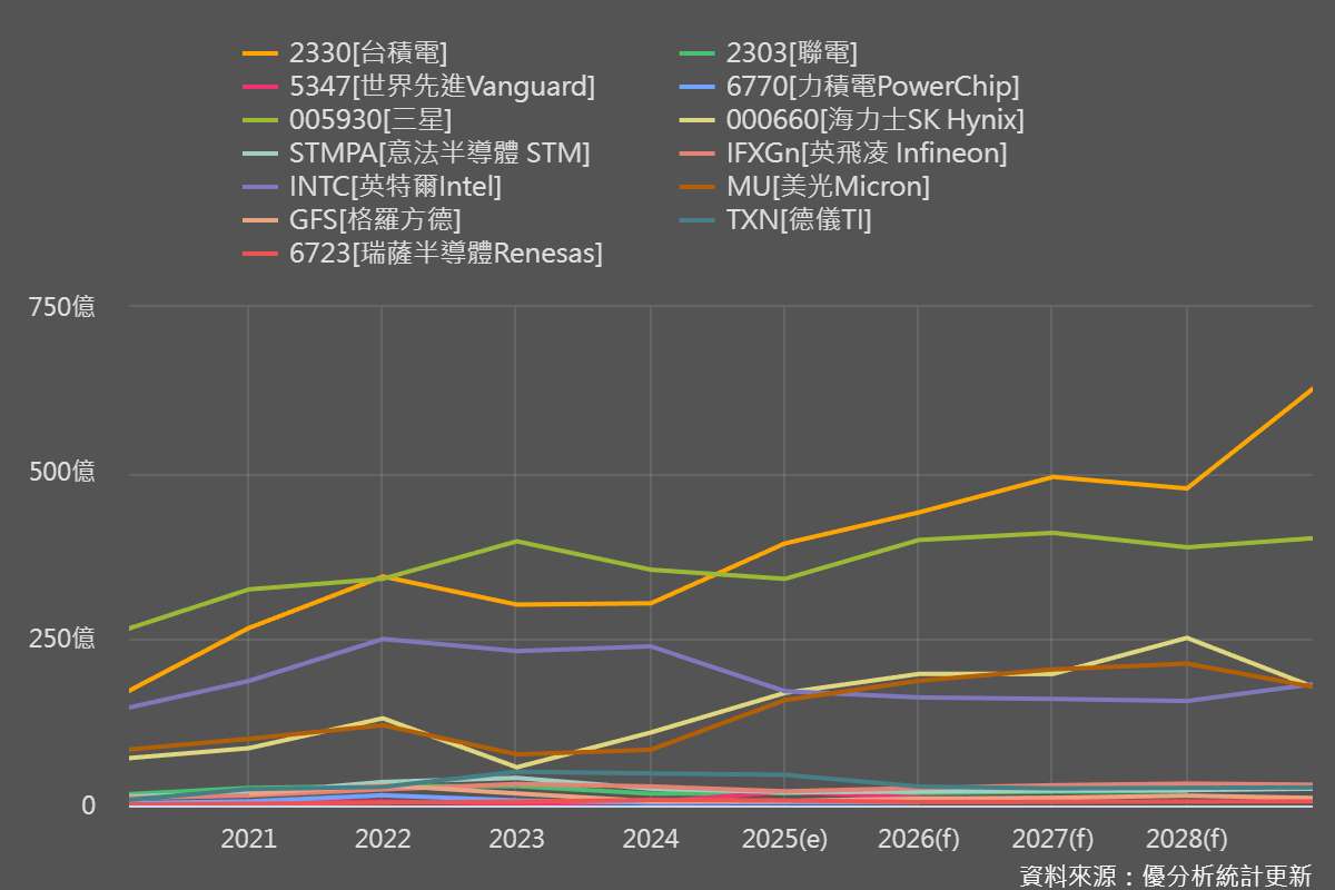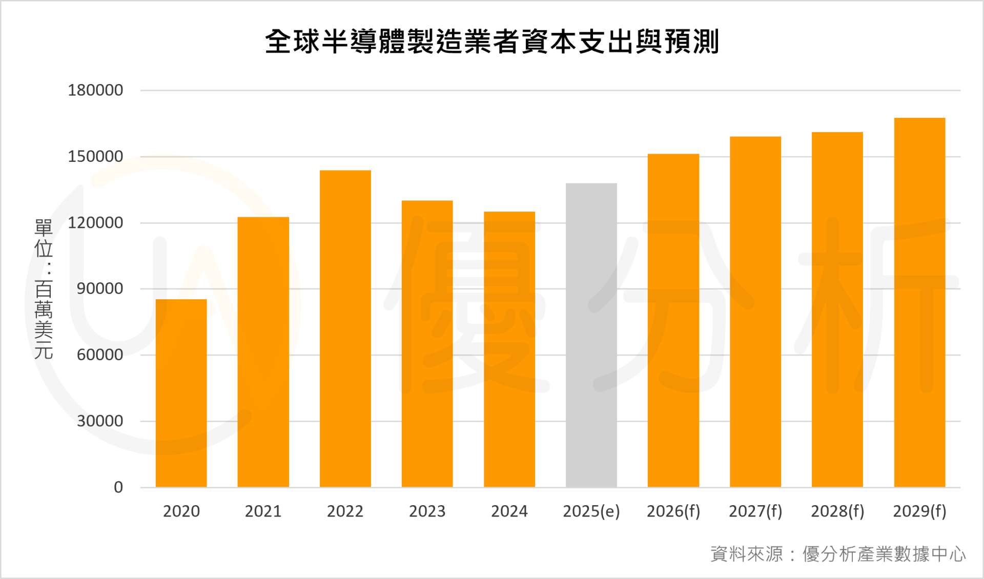 從上圖可以看到,幾大半導體廠對未來幾年的資本支出仍維持在高檔水準;只要半導體廠還在蓋新廠,無塵室與機電工程的需求就有延續性。