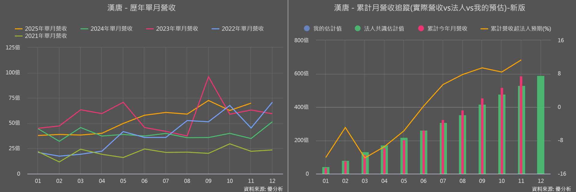 從下圖可以看到,今年以來營收走勢呈現穩步向上,其中 11 月營收達 69.94 億元,月增 11.6%、年增 100.38%,不只創同期新高,也明顯優於市場原先預期。
