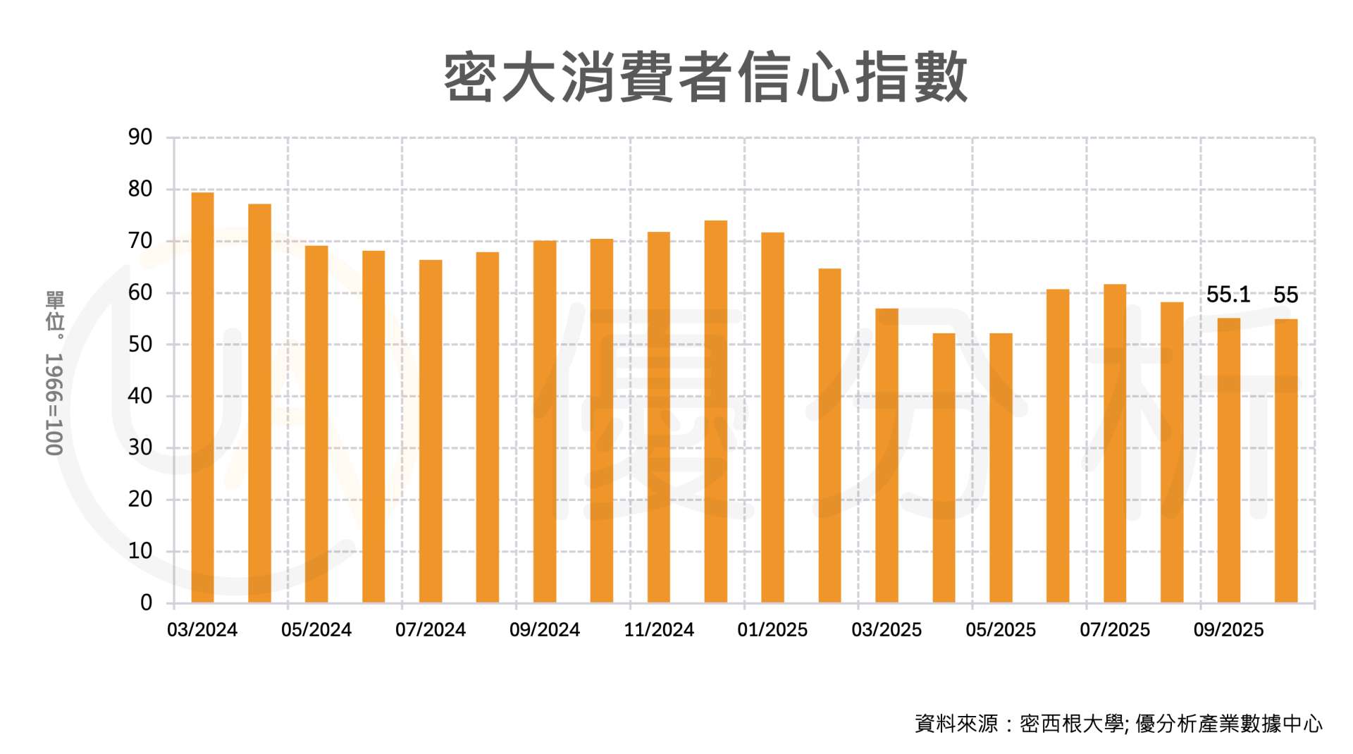 2025年10月12日(優分析產業數據中心)—— 美國消費者情緒在10月「不樂觀、但沒再惡化」——密西根大學初值顯示信心指數為55,與9月的55.1幾乎持平、優於華爾街預期的54,反映即便聯邦政府關門掐住官方數據供給、千名公務員被迫停工,民眾對經濟看法仍大致維持現狀;不過指數仍接近歷史低檔,顯示高物價與就業降溫擔憂未退場。