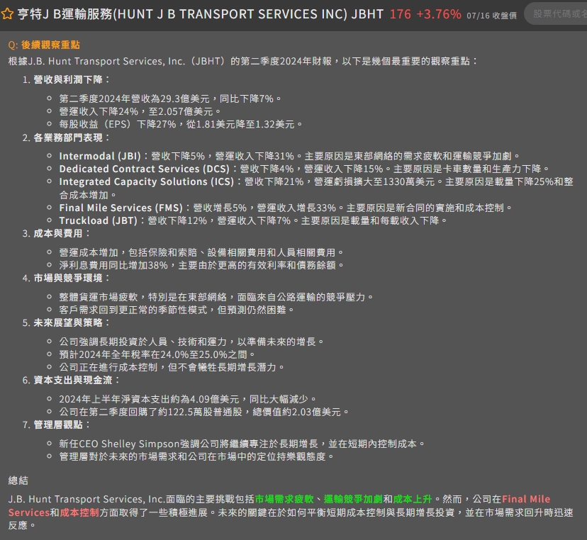 由於駕駛員和非駕駛員的工資成本上升、未充分利用設備的擁有成本增加、維護支出增加以及保險和索賠成本較收入增加,聯運部門的營業收入下降了31%。JB Hunt 在聲明中提到:"儘管本季度需求有所季節性增長,但整體表現仍受到疲軟的貨運市場及其對東部公路卡車競爭的影響的壓力。"