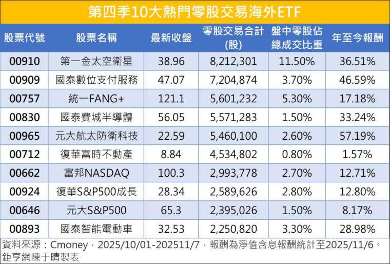 觀察 10 月以來盤中零股熱門成交標的,根據 CMoney 統計數據顯示,第一金太空衛星 (00910-TW) 以總成交股數達 821 萬 2301 股奪下第一,國泰數位支付服務 (00909-TW) 總成交股數達 720 萬 4874 股居次,第三至五名依序為統一 FANG+(00757-TW)、國泰費城半導體 (00830-TW)、元大航太防衛科技 (00965-TW) 累計成交股數皆逾 500 萬股。