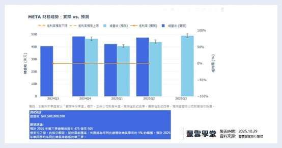 總營收: Q2 總營收達 $47.5 billion,年增 22%(按報告及固定匯率計算),符合市場預期的高點。營運收入為 $20.4 billion,營運利潤率達 43%。Q3 營收展望: 公司預計 Q3 營收將介於 $47.5 billion 至 $50.5 billion 之間,並預期外匯將對年增率產生約 1% 的順風效應。利潤結構: 由於 Meta 產品結構穩定,本次法說會未對毛利率進行特別強調,但強勁的 43% 營運利潤率體現了利潤結構的穩定性。