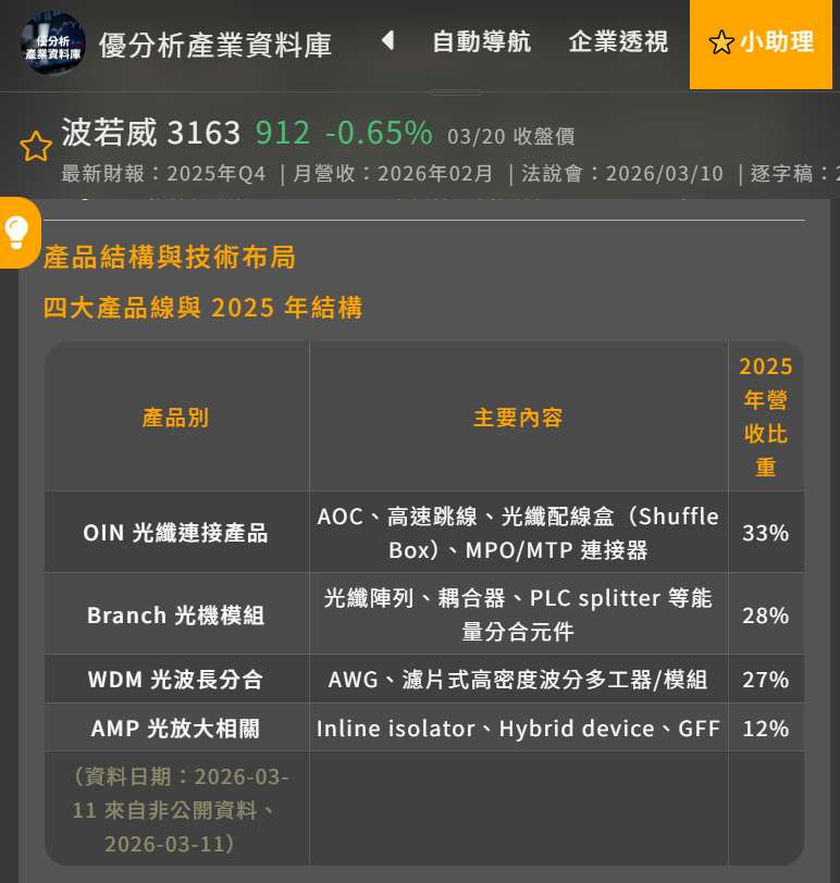 波若威(3163-TWO): 在機櫃連結所需的 Shuffle Box(光纖分配器)中扮演關鍵代工角色。