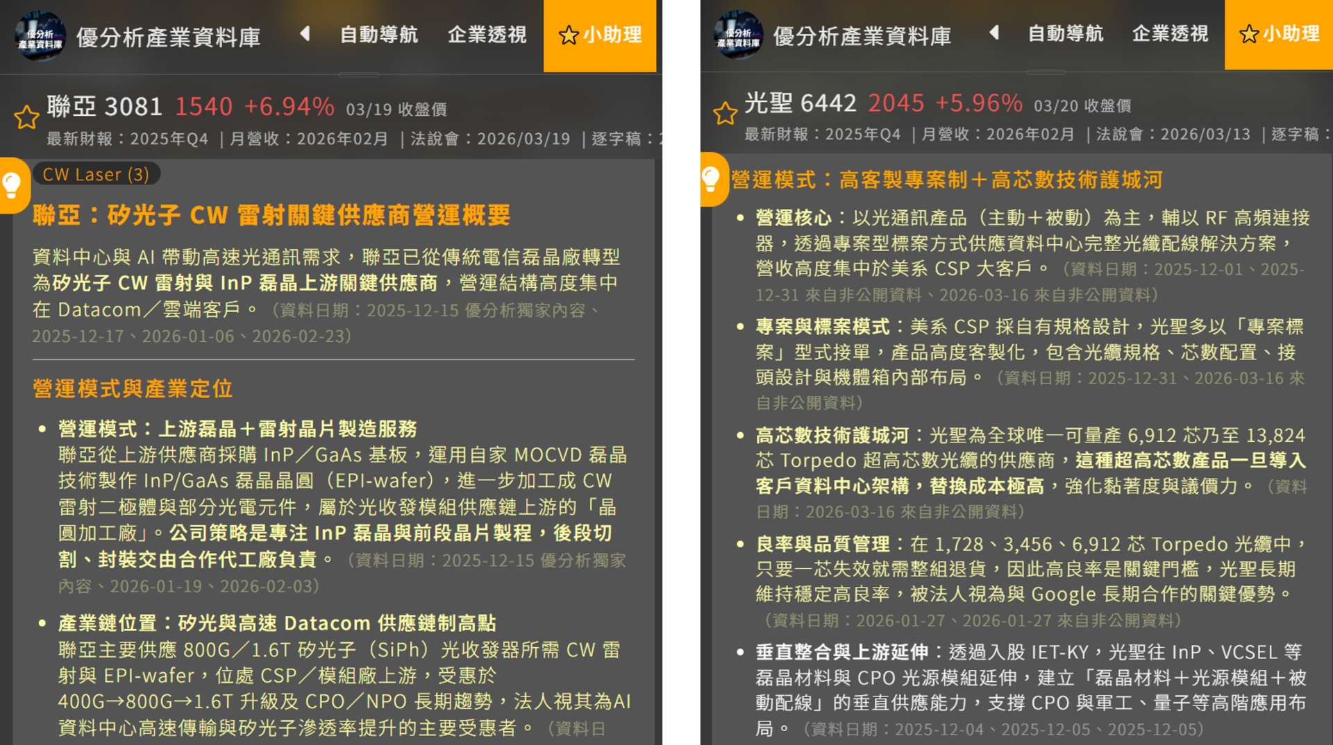 聯亞(3081-TWO)、光聖(6442-TW): 物理 AI 的傳輸核心在於「雷射光源」,聯亞具備稀有的雷射端技術認證,而光聖則在光纖連接器上具備高技術門檻,是這波「光進銅退」趨勢下的隱形冠軍。