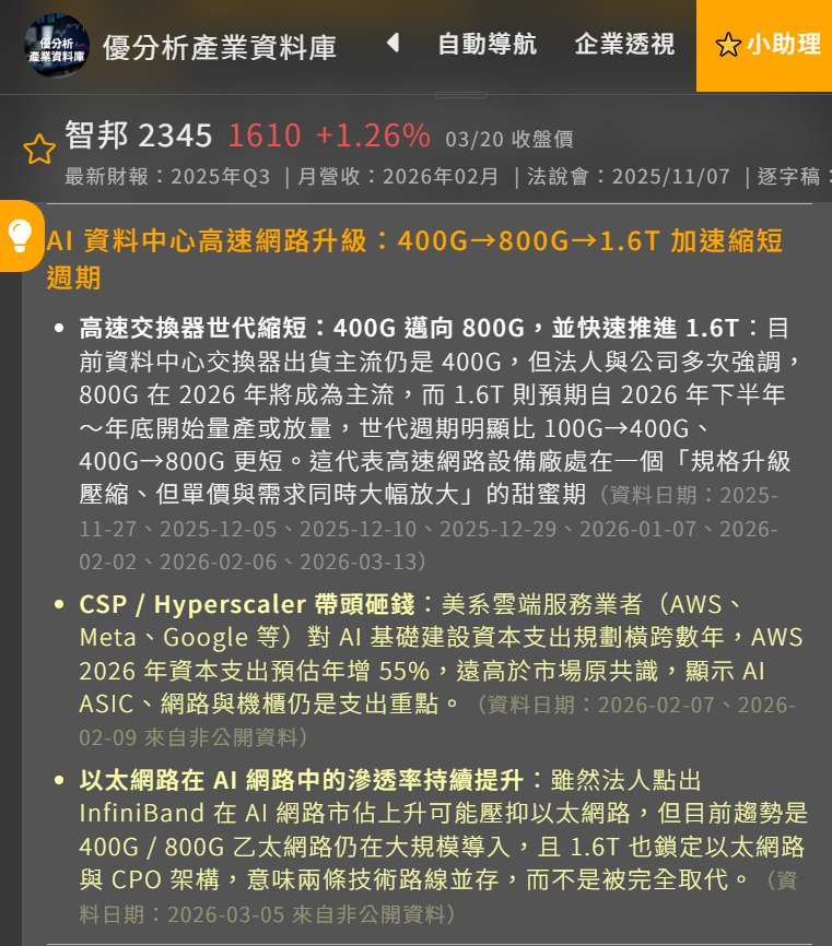 智邦(2345-TW): 作為交換器大廠,智邦正積極與 NVIDIA 陣營研發光通訊上游技術,解決機櫃間傳輸的熱量與速度問題。