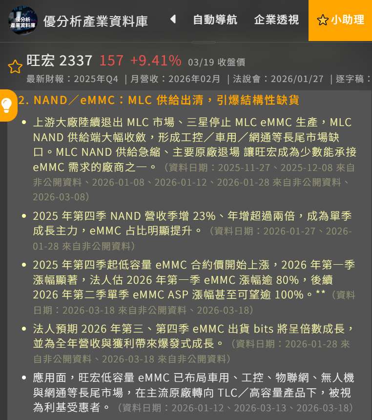 旺宏(2337-TW): 當三星(Samsung)為了搶攻高毛利的 AI 記憶體而決定退出低階 NAND Flash(如 eMMC)市場時,旺宏成為了最大的受益者。物理 AI 設備(如醫療器材、網通、基礎型機器人)仍需要大量的穩定儲存設備,旺宏在此展現了「撿到槍」的轉單優勢。