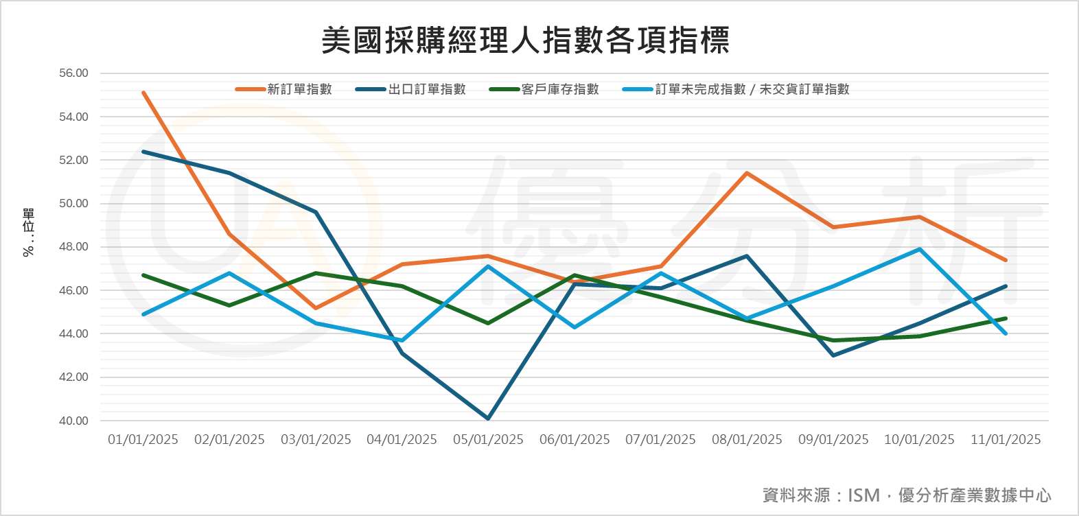 2025年12月02日(優分析/產業數據中心報導)⸺ 美國製造業景氣連續第九個月萎縮,反映企業對總體經濟前景依然保守。根據供應管理協會(ISM)公布的報告,11月製造業採購經理人指數(PMI)自前月的48.7降至48.2,低於市場預期的49,顯示製造業景氣仍處於收縮區間。