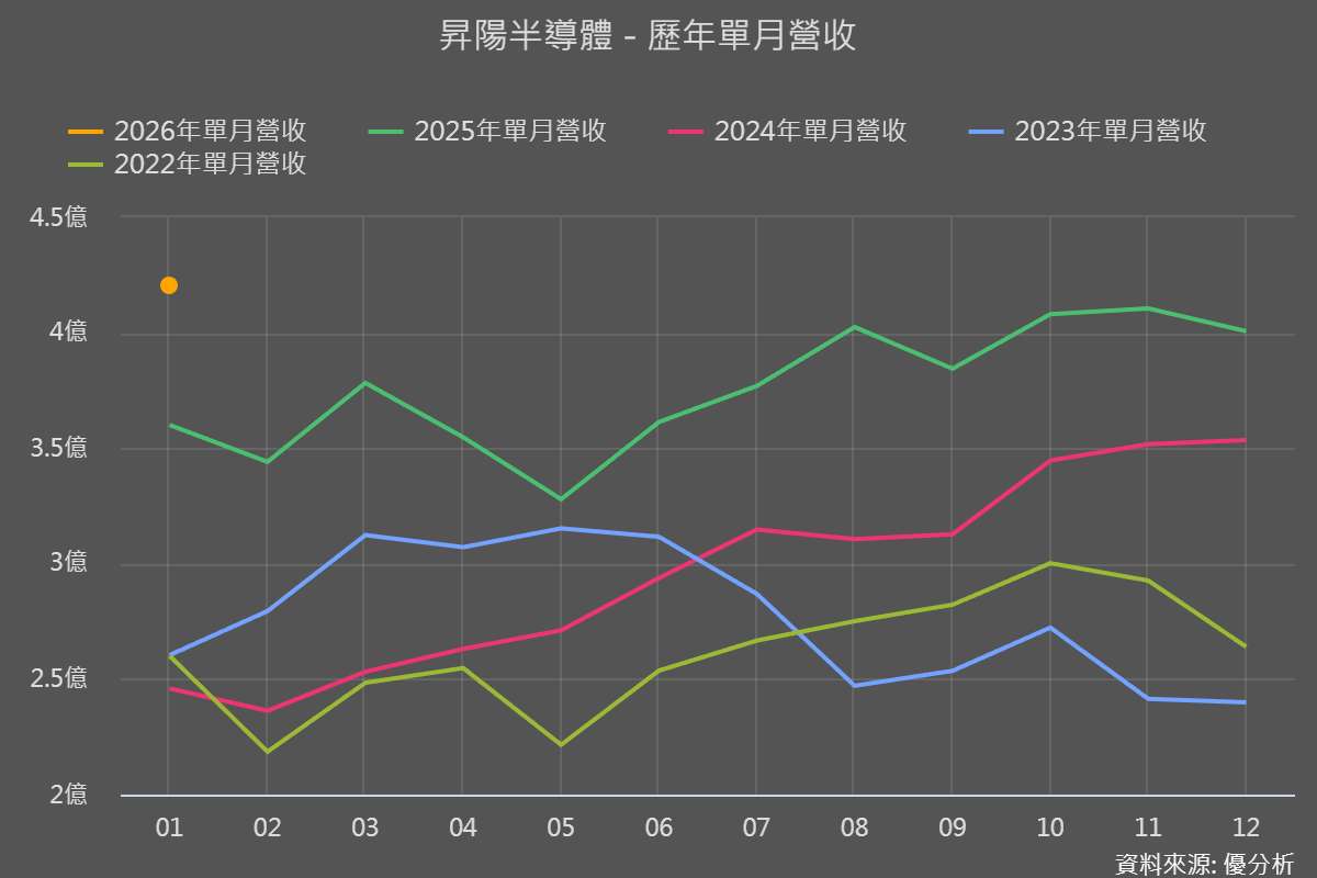 2026 年 1 月營收 4.2 億元,月增約 4.85%、年增約 16.68%,再度刷新歷史紀錄,顯示 2025 年下半年至 2026 年初接單與出貨仍維持高檔水準。