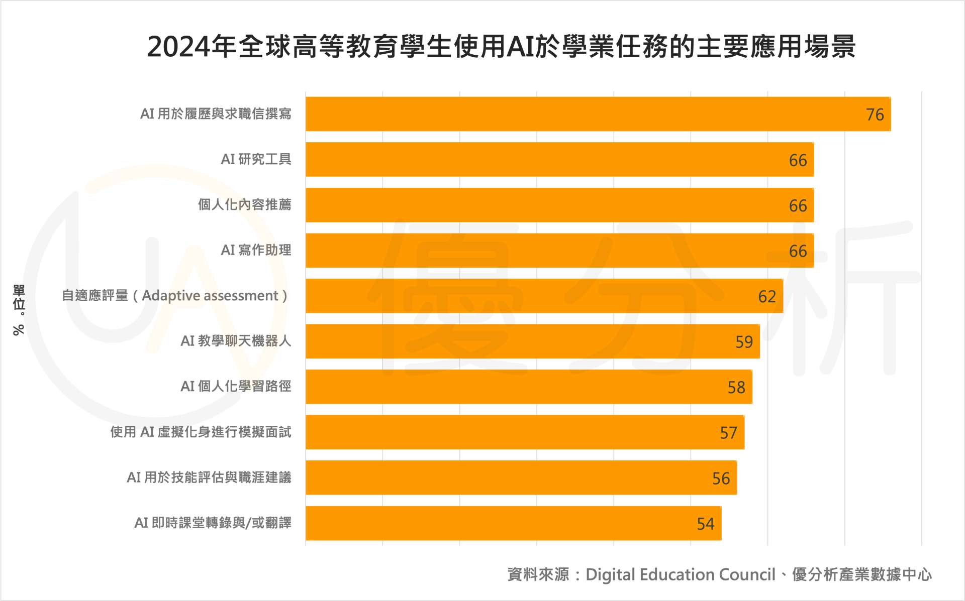 2025年10月5日(優分析產業數據中心)——生成式人工智慧(AI)正全面滲入高等教育現場,不僅改變學習方式,也重塑職涯準備。根據2024年7月的全球高等教育學生調查,86%的受訪者表示曾使用AI於學業任務中,其中76%用於撰寫履歷與求職信,66%使用AI進行寫作輔助、內容推薦或研究,57%甚至使用AI虛擬化身(avatar)進行模擬面試。AI正逐步取代傳統的學習助教與職涯輔導角色,成為大學生的新「學習夥伴」。