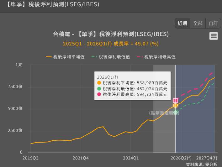 根據IBES市場預估統計,分析師預計台積電首季淨利將達5,390億新台幣,若優於上一季的5,057億新台幣,將創下單季獲利的歷史新高,並達成連續九季獲利成長。先前公司已公布第一季營收年增35%,優於市場預期,顯示AI需求持續強勁。