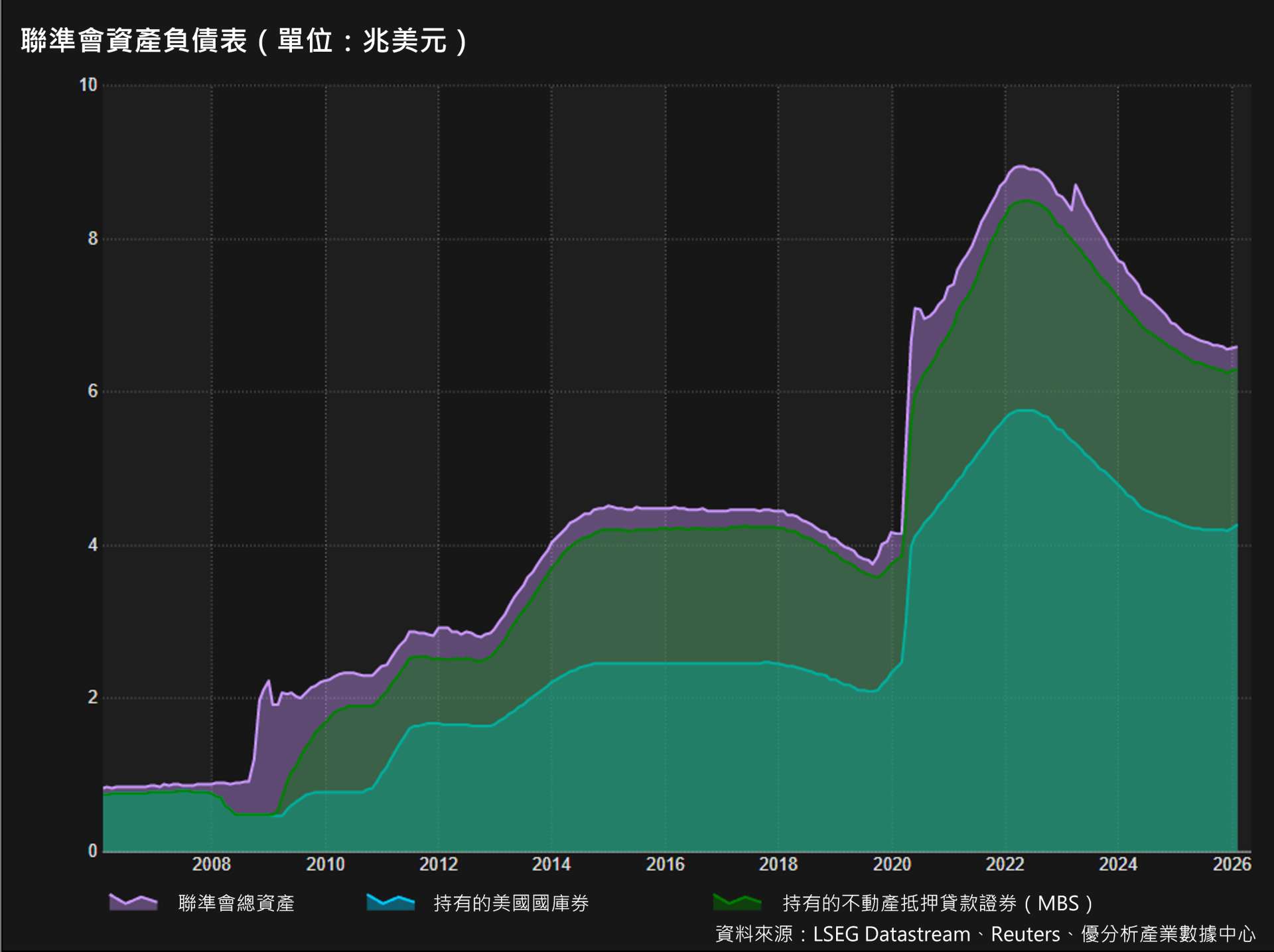 過去十多年,美國在金融危機與疫情期間,多次由聯準會出手穩定市場,大量買進公債與房貸相關債券,讓金融體系中的資金變得更加充裕。久而久之,市場自然形成一種直覺:為了避免金融市場出問題,聯準會其實很難把這些資金完全收回來,貨幣供給長期偏多的風險始終存在。
