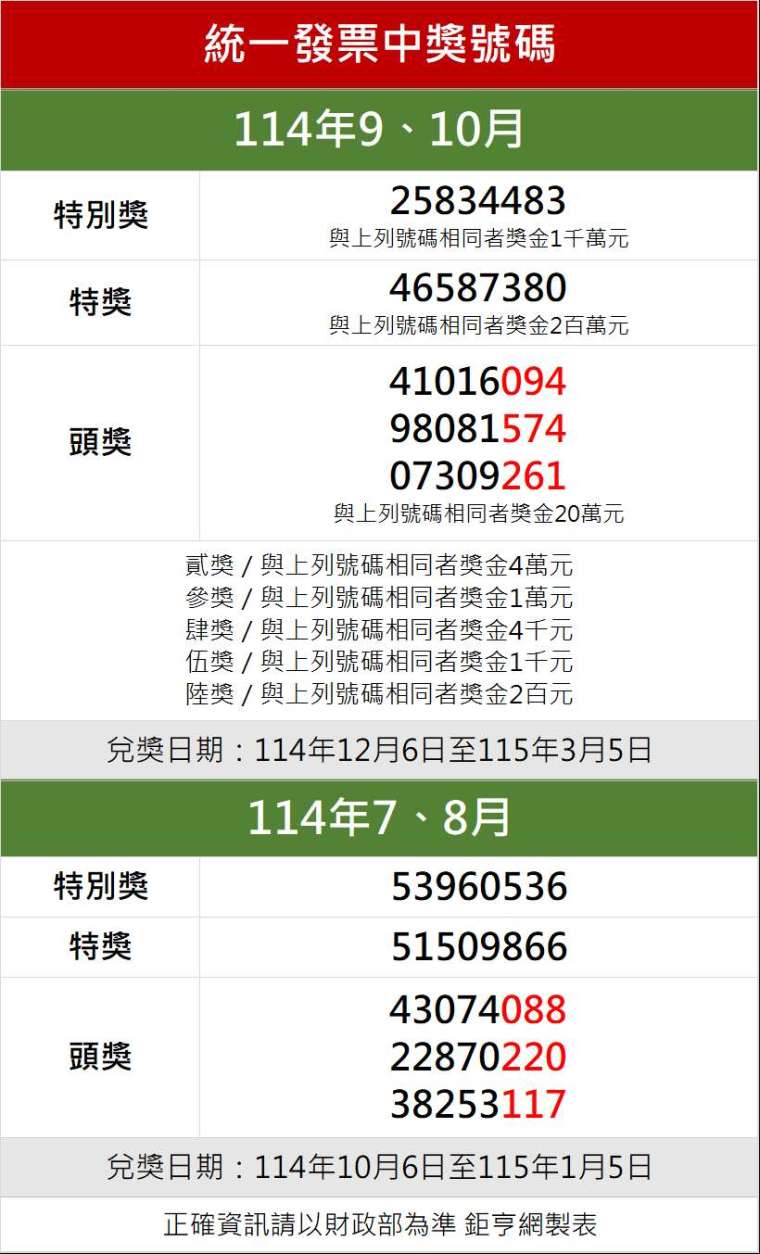 114 年 9、10 月期統一發票中獎號碼,今天下午在三立 iNEWS 頻道直播開獎。特別獎 (1000 萬元)「25834483」;特獎 (200 萬元)「46587380」;頭獎 (20 萬元) 3 組分別為「41016094」、「98081574」、「07309261」。