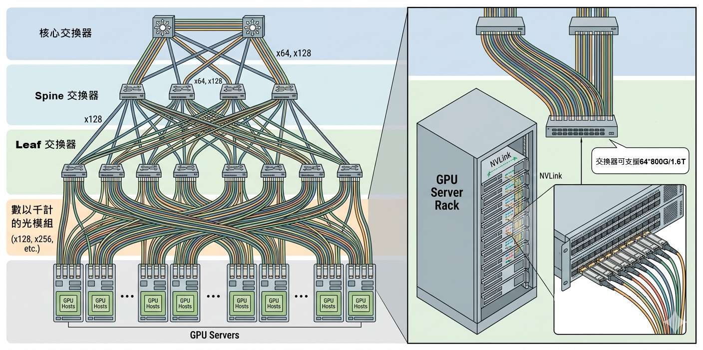 就是這種「每一點都要連到每一點」的需求,讓光模組的使用量遠遠超過了傳統網路設計的想像。