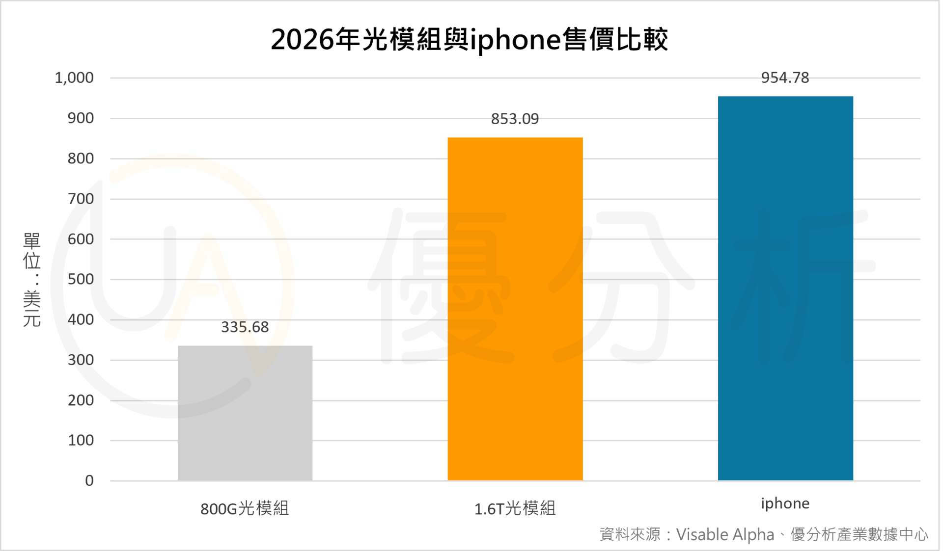 從光模組龍頭廠商,中國的中際旭創來看,可以看到目前每支800G光模組的出貨成本價落在335美元;1.6T光模組的成本價約落在853美元;而每支iphone的成本均價約落在954美元。