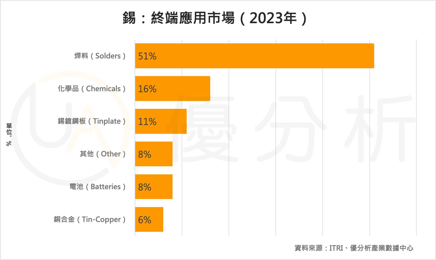 以技術使用市場來看,根據市場研究機構ITRI指出,電子焊接材料(soldering)是錫最大的下游應用,占全球消費量的約47%。錫焊料廣泛應用於電路板、智慧手機、筆記型電腦、家電等電子產品的生產過程,為不可替代的關鍵材料。隨著全球數位化進程加快,以及5G、AI、IoT等設備需求提升,錫的結構性需求維持成長趨勢。