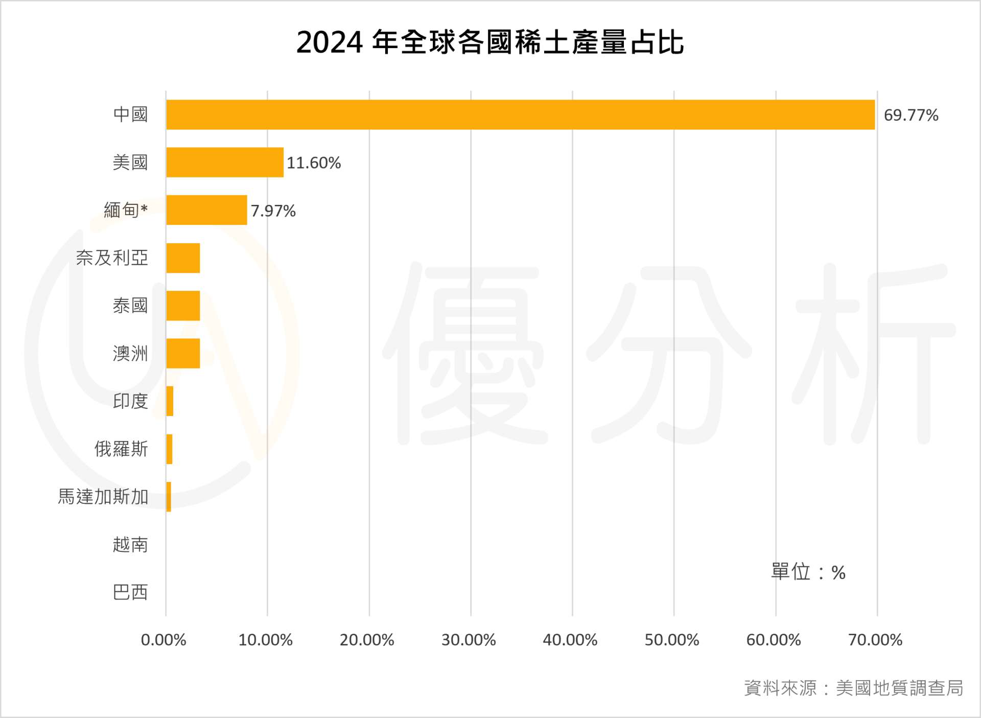 各國正嘗試建立獨立的稀土與磁鐵供應鏈,但受地質稀缺、技術複雜與環境挑戰限制。重稀土在中國與緬甸以外極為少見,新礦開發需時8至10年,而精煉建設週期約5年、磁鐵生產也需長期投資。部分稀土相關企業可能在供應中斷下受到關注,如:Iluka Resources (ILU-AX) 、Lynas Rare Earths (LYC-AX) 和 MP Materials Corp (MP-US) 等。下圖可進一步看出,中國在全球稀土生產中的主導地位: