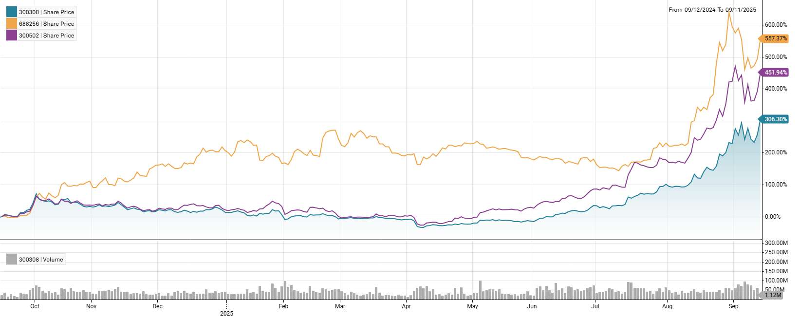午盤時,滬深300指數上漲1.8%,上證綜指漲1.1%,反觀香港恆生指數小跌0.3%。AI板塊成為主角,本地AI概念股大漲6.5%,成功扭轉上週逾10%的跌勢。其中,寒武紀科技(688256-SS)股價跳漲11%,光模組大廠中際旭創(300308-SZ)和新易盛(300502-SZ)更分別飆升14%與12%。今年以來,人工智慧與科技題材一直是股市主力,科創50指數至今累計上漲34%。