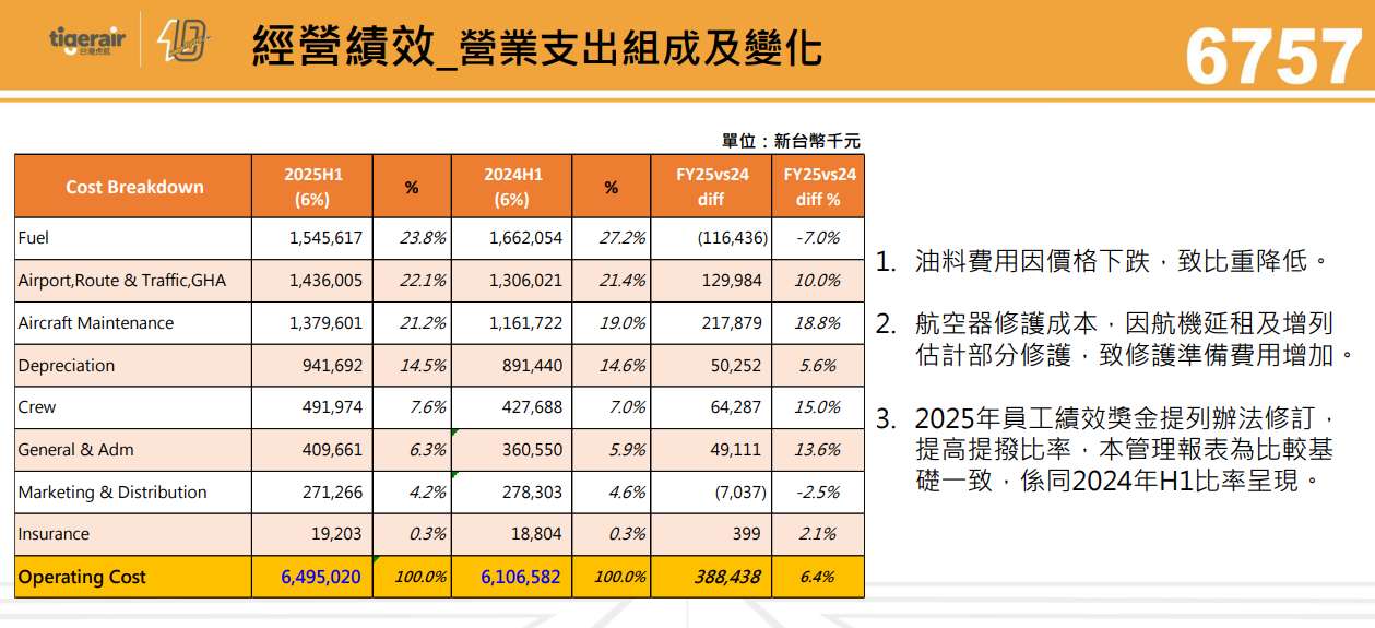 台灣虎航(6757-TW)是亞太區低成本航空的績優生,但根據其2025年上半年成本表顯示,雖然燃油費用下降了7%(年減約11.6億新台幣),但整體營運成本仍比去年同期上升6.4%,達到64.95億新台幣。