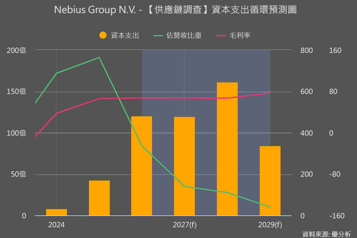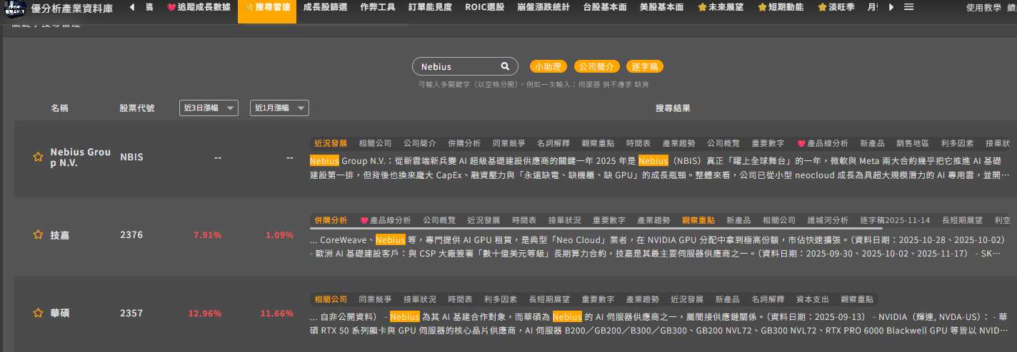 值得注意的是,Nebius AI 基礎設施擴張也帶動台灣伺服器供應鏈受惠,相關硬體供應鏈包括華碩(2357-TW)、技嘉(2376-TW)與華擎(3515-TW)等台廠。其中華碩已在2025年向 Nebius 出貨 GB200 NVL72 AI 伺服器,並已取得新一代 GB300 NVL72 訂單。其液冷基礎設施供應商為美商Vertiv(VRT-US)。