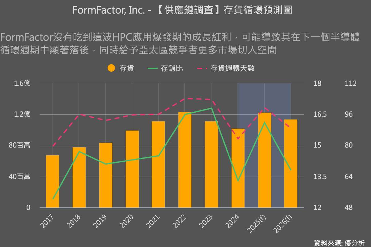 優分析專欄先前指出,FormFactor在AI與HPC晶片測試市場反應相對遲緩,未能及時布局新一代高密度探針卡與高頻測試解決方案,使其在近兩季全球市占率出現下滑。該公司喪失這波HPC應用爆發期的成長紅利,可能導致其在下一個半導體循環週期中顯著落後,同時給予亞太區競爭者更多市場切入空間。
