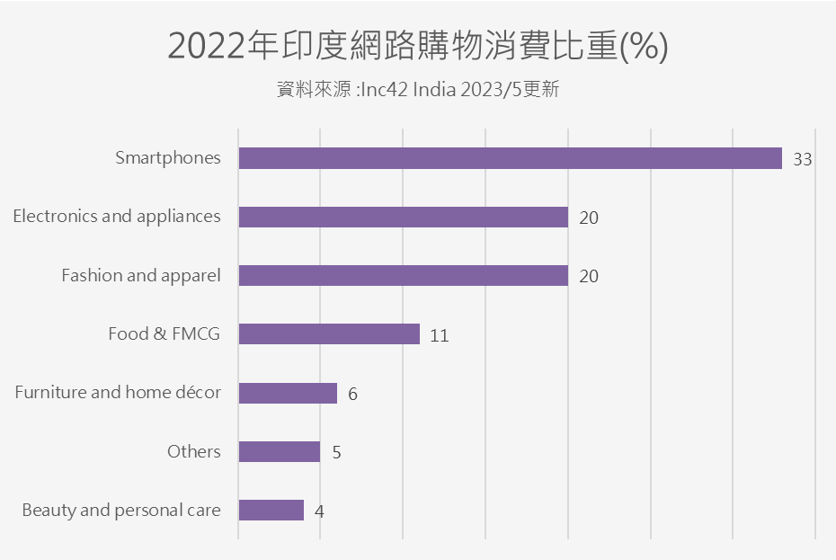 雖然整體消費力沒有很強,消費大約占印度GDP的60%,根據印度央行預測,到2024年的3月印度GDP成長大約是6.5%,線上購物卻能有雙位數的成長率,顯示消費板塊正在移動。
