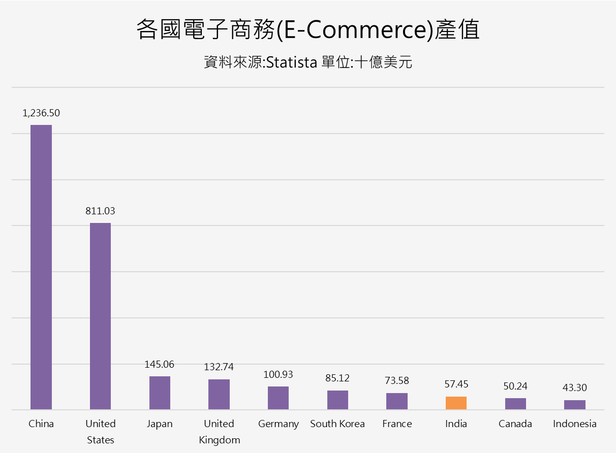根據另一份研究資料,印度目前網路購物產值排名全球第8名,若真的到了2030年產值擴大到3500億美元附近,將成為除了中國及美國以外第三大市場,超越日本。