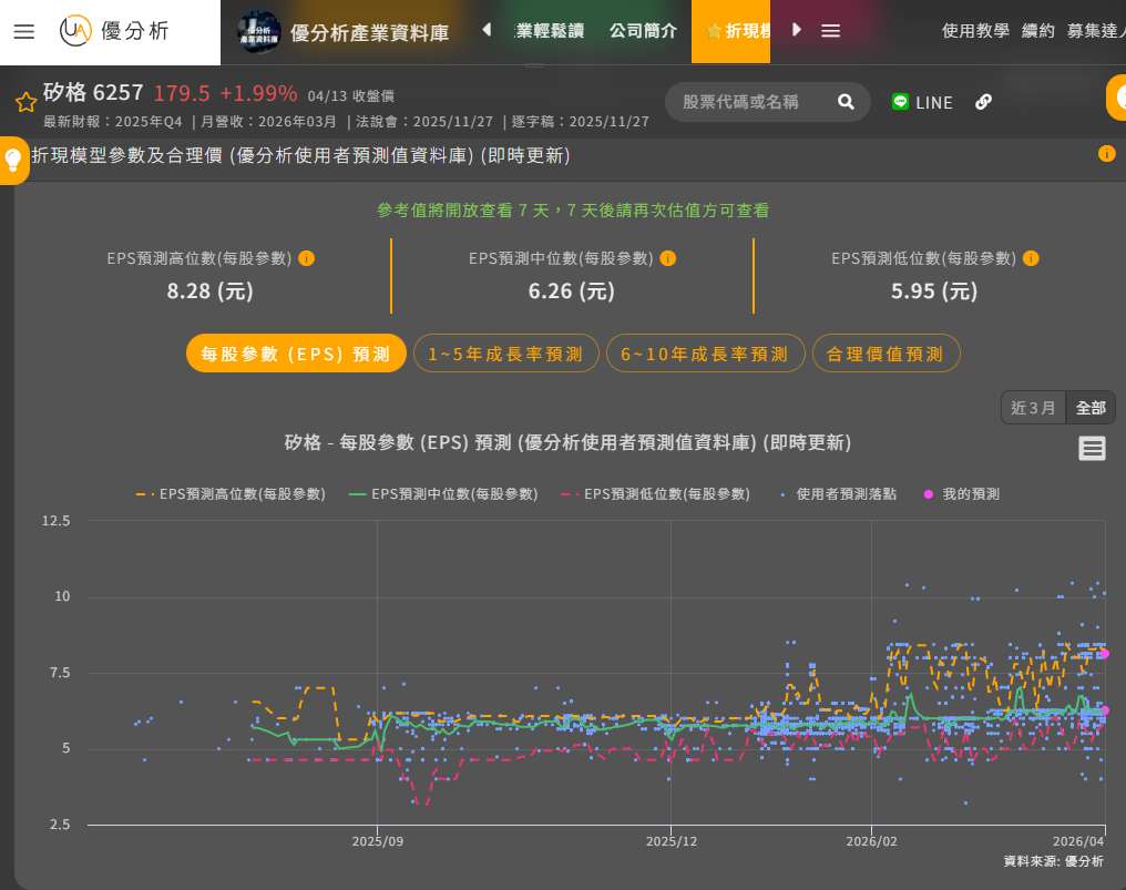 因為法人只有估兩年(2025-2026-2027),所以後面三年要自己思考可以怎麼填,可以用產業成長率,如果公司有提供未來幾年的展望會成長多少%,同業的展望成長率大約多少%也可以參考著填看看,或是完全都沒概念那就填長期通膨率2%看看;6-10年那格也是相同的道理,之後右下角就會出現算出來的合理價。