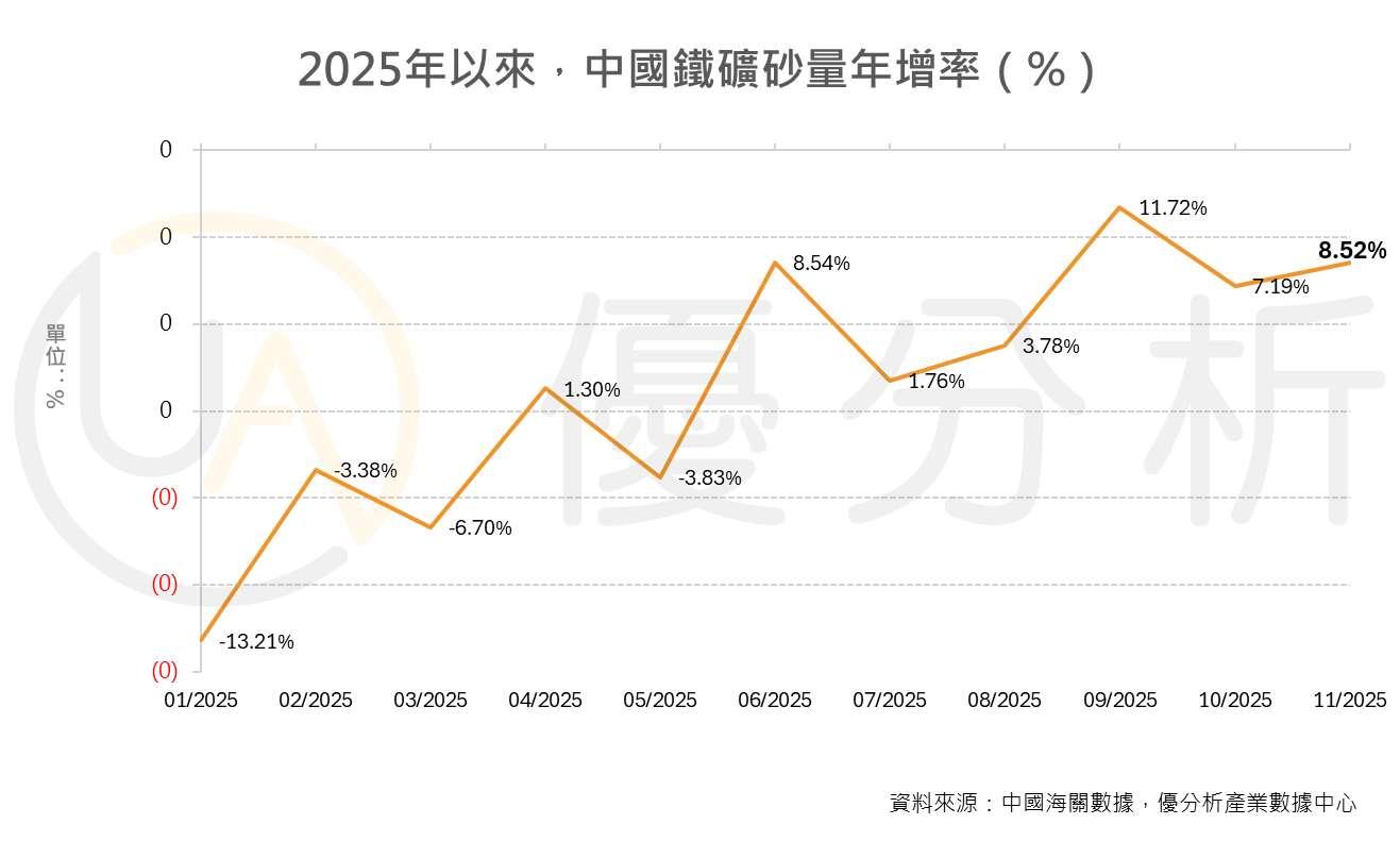 中國11月鐵礦砂進口量年增8.52%,符合市場預期,研調機構Mysteel認為,部分鐵礦產品的品位下降導致需要更大量的進口來補充產能,而中國鋼廠現在每天至少236萬公噸的熱金屬產出也支撐了進口需求。