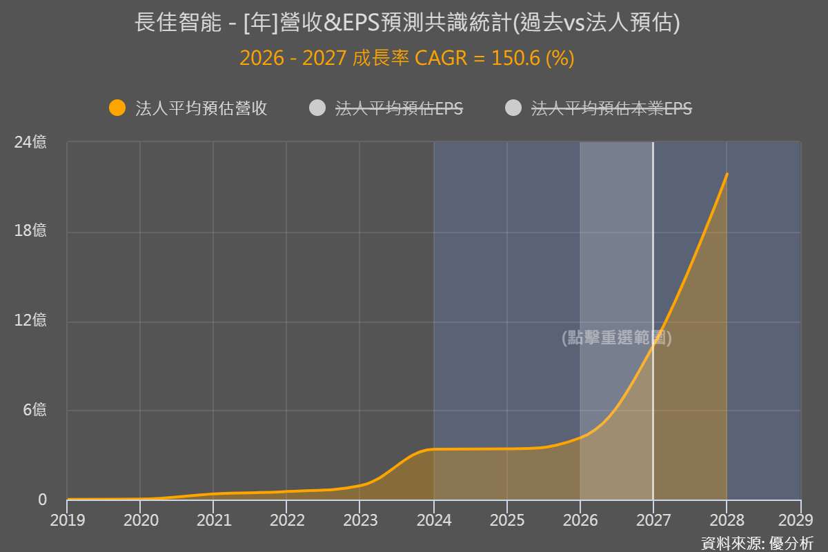 公司內部報告提及,愛寶第一代已累計 700–800 台確定訂單,其中光是集團內部就有約 500 台。若量產順利,預期 2026 年起逐步放量,並在 2027 年開始顯著貢獻營收。其中法人平均預估,長佳智能在 2026-2027 年的營收 CAGR 有望上看 150.6%。