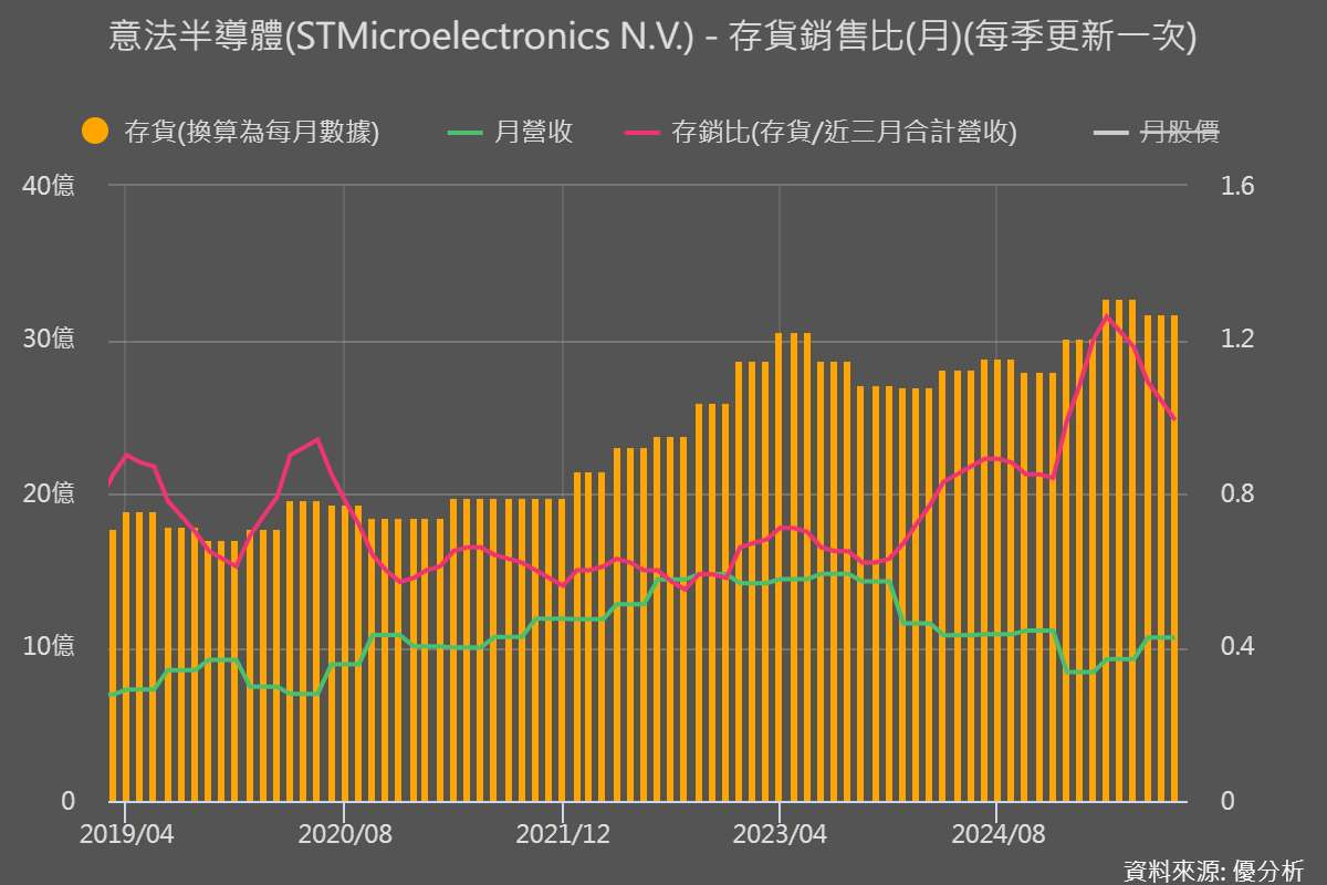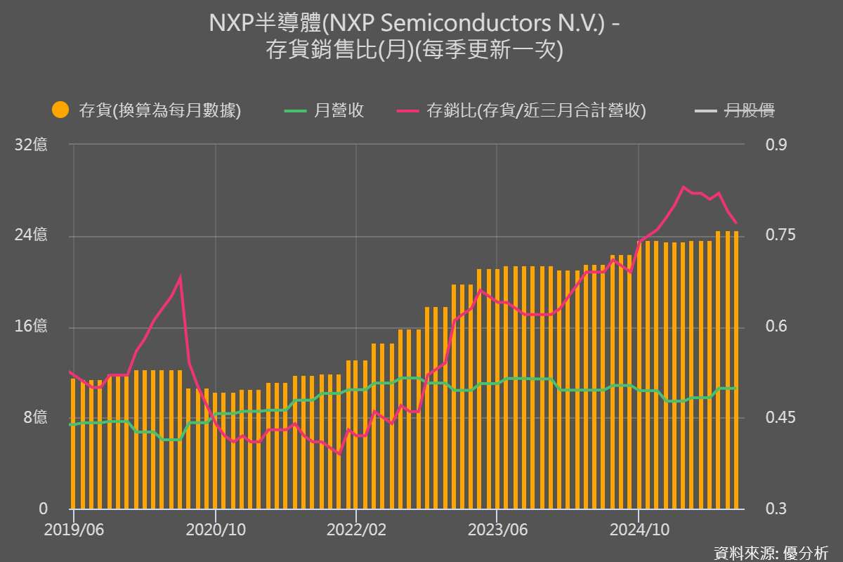 為了確認這樣的循環位置並非微芯獨有,我們再觀察同樣重要的工業類比與 MCU 指標企業──德州儀器(TXN-US)、NXP半導體(NXPI-US)以及意法半導體(STM-US)。從下面幾張圖可以看到,這些同業公司的存銷比也處於高檔,代表工業鏈的庫存壓力並非單一企業現象。但營收都已經落底正在緩步回升,與微芯的走勢高度一致。