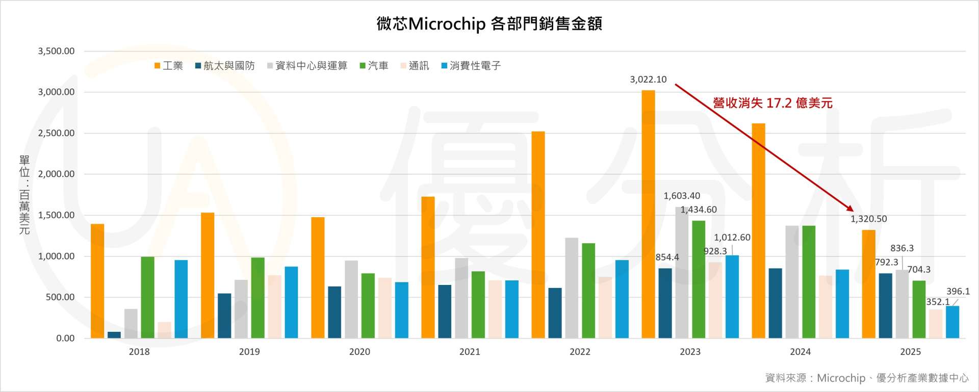 從下圖的分部營收結構來看,微芯的工業部門營收在 2018–2023 年間一路攀升,並在 2023 年達到約 30.22 億美元的高點,是所有終端市場中規模最大的一塊。然而到了 2025 年,工業營收明顯縮水至約 13.20 億美元,跌幅超過一半,是所有部門裡下滑最明顯的一段,也反映工業活動在過去一年半中經歷了極深的修正。
