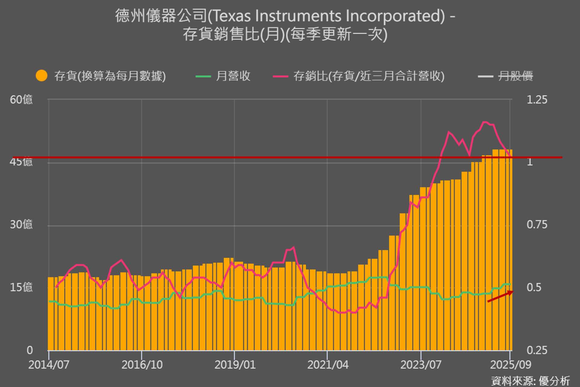 存銷比高,代表庫存相對目前的營收還是偏高,產業仍背負著調整壓力。上季庫存天數約 199 天,仍高於長期目標 130–150 天,顯示目前還在修正之前累積的庫存壓力,終端客戶的補庫循環還沒全面展開。