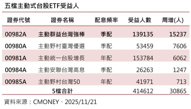無畏台股大跌大漲劇烈震盪,主動式台股 ETF 人氣持續暢旺。根據集保戶股權分散 11 月 21 日最新統計資料顯示,5 檔主動式台股 ETF 受益人全數創高,整體受益人數上周增加 30865 人,統計總人數來到 41 萬 4612 人,已連續第 6 周創下歷史新高。單檔表現來看,挾帶著近 9% 年化配息率光環的主動群益台灣強棒 (00982A-TW) 受益人周增 1.5 萬人奪下最佳人氣王。