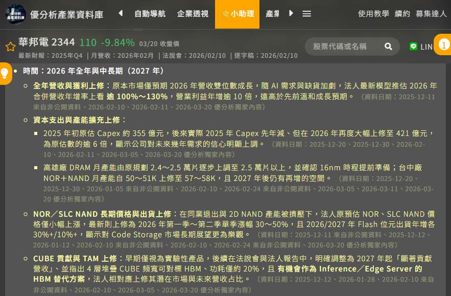 華邦電本身已將 2026 年資本支出大幅提高至 421 億元,顯示公司正提前布局未來需求;同時,同業也開始啟動新一輪擴產。