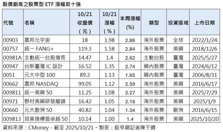 美中貿易角力緩解,美股四大指數全面走揚,台股加權指數今 (21) 日盤中最高衝到 27969.15 點,距離叩關 28000 點近在咫尺,惟下半場漲幅收斂,終場小漲 63.78 點,收在 27752.41 點,續寫收盤新高,多頭力道看回不回,ETF 市場也強強滾,全體 150 檔原型股票型 ETF 中,有 56 檔收盤同創新高,漲幅前十強中多達 7 檔為海外股票型,00757 與 009811 堪稱美股 ETF 最強兄弟檔,值得注意的是,00981A 是唯一進榜的主動式 ETF,更強勢登上第三。