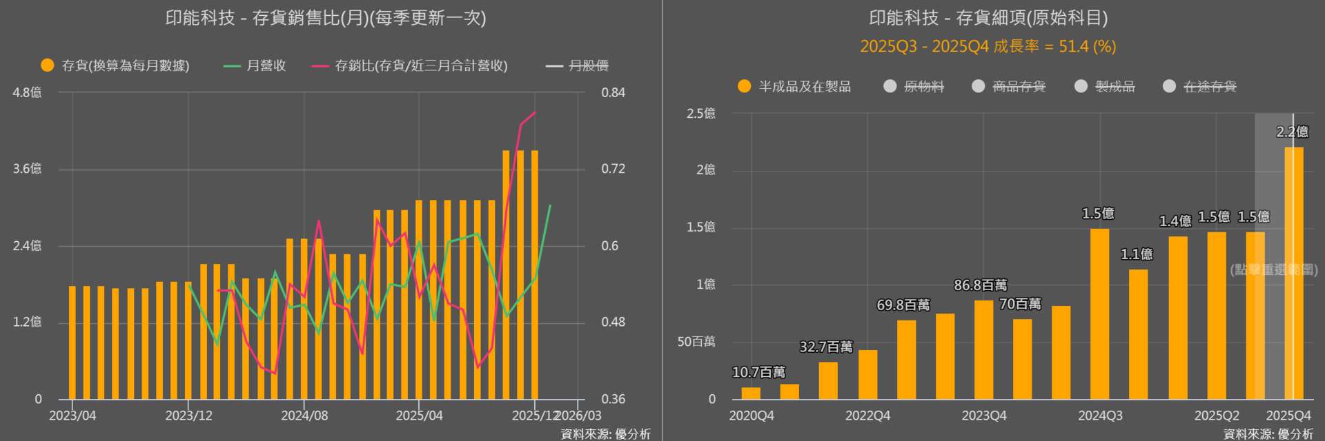 從下圖印能科技的最新生產活動可以發現,存貨金額持續處於上升趨勢,但存銷比也逐步攀升,並來到相對高點。