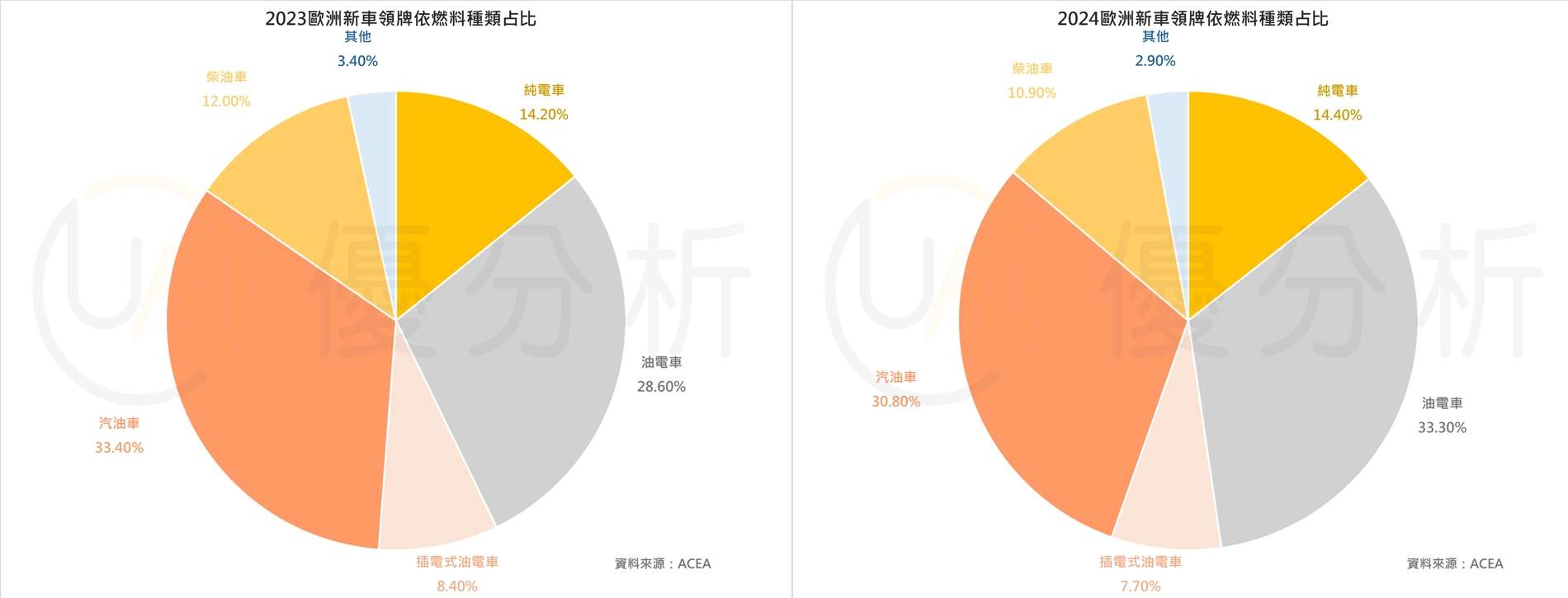 歐洲市場的趨勢顯示,傳統內燃機車型(汽油車和柴油車)的需求正在減少,而混合動力和純電車型則成為主要增長點,反映出市場對低碳和環保車型的偏好加強。
