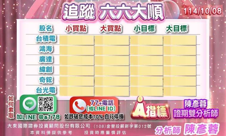 台幣貶值效應權值股賣壓較重,台積電 (2330-TW),拉高看到 66 大順【表格】 【小目標價】 站賣方,鴻海(2317-TW),廣達(2382-TW),緯創(3231-TW) 才剛轉弱別太早買進,表格中的【小買點】可以小買。台光電 (2383-TW) 多空一線變盤留意補跌? 買點再觀察,奇鋐(3017-TW),線型較好,但是如回測 表格【小買點】空間較大。【66 大順】表格如下,歡迎索取表格按表操課。