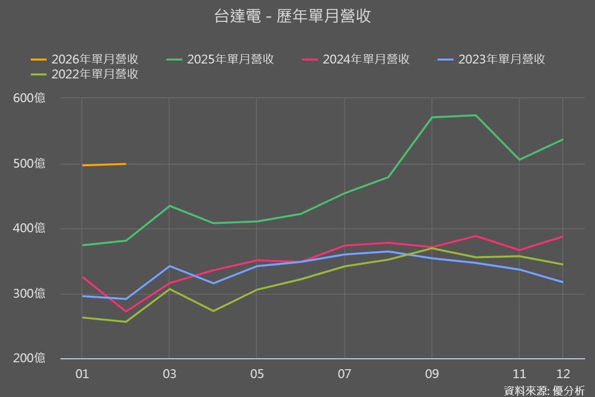 進入 2026 年,1 月與 2 月在工作天數偏少的情況下,單月營收仍維持約 496~499 億元,年增超過 30%,延續高檔成長動能。