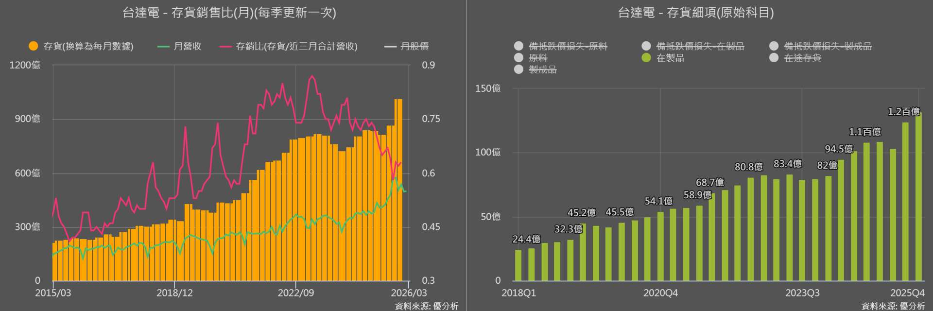 從下圖台達電(2308-TW) 最新生產活動來看,庫存水位已從疫情後高檔壓力區,回落至相對健康區間。存貨金額隨營收擴張持續拉高;存銷比則由過去約 0.8 倍降至 2025 年第四季的 0.63 倍,加上存貨週轉率持續提升,在製品金額持續增加,顯示公司為支應 AI 電源與液冷專案交付正積極備貨。