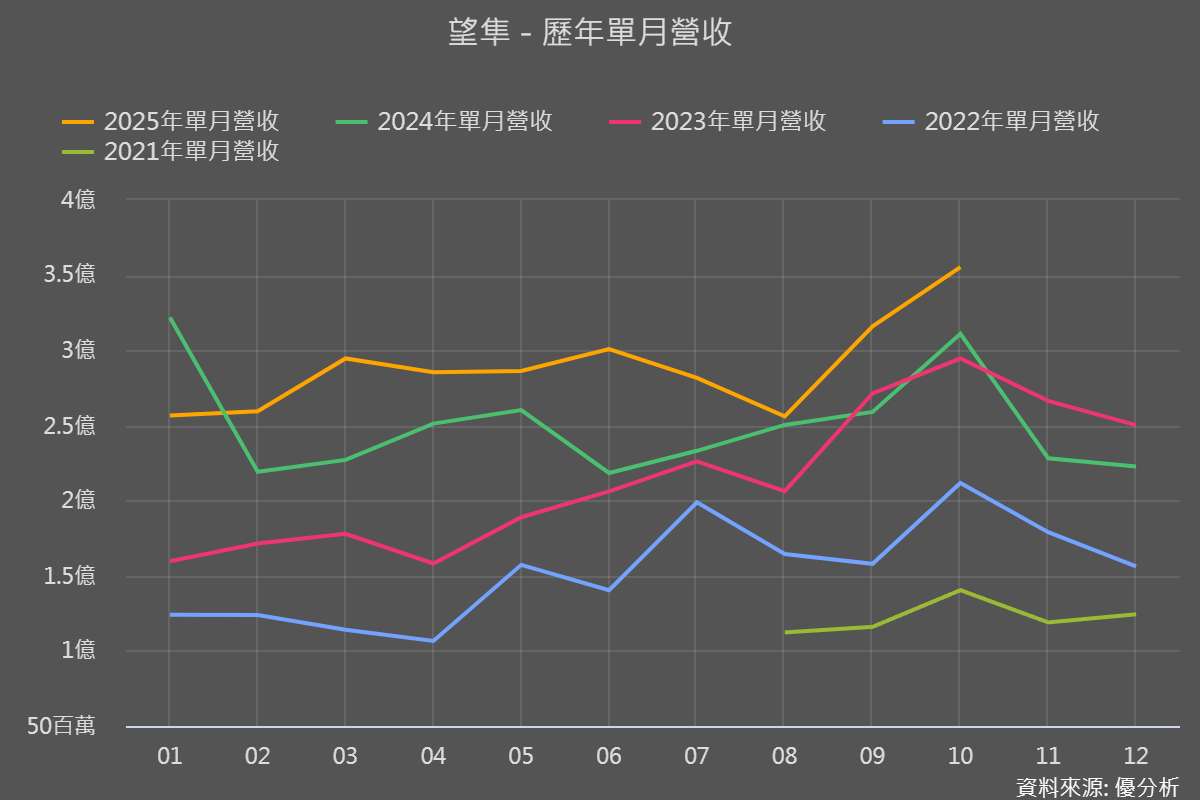 2025年11月06日(優分析/產業數據中心報導)⸺ 望隼(4771-TW)10月營收衝上3.55億元,月增12.48%,年增14.25%,創下單月歷史新高。表面上看,是受惠中國雙11備貨與日本市場銷售熱潮,但細看結構可以發現這波成長其實來自9月開始的需求端回補。