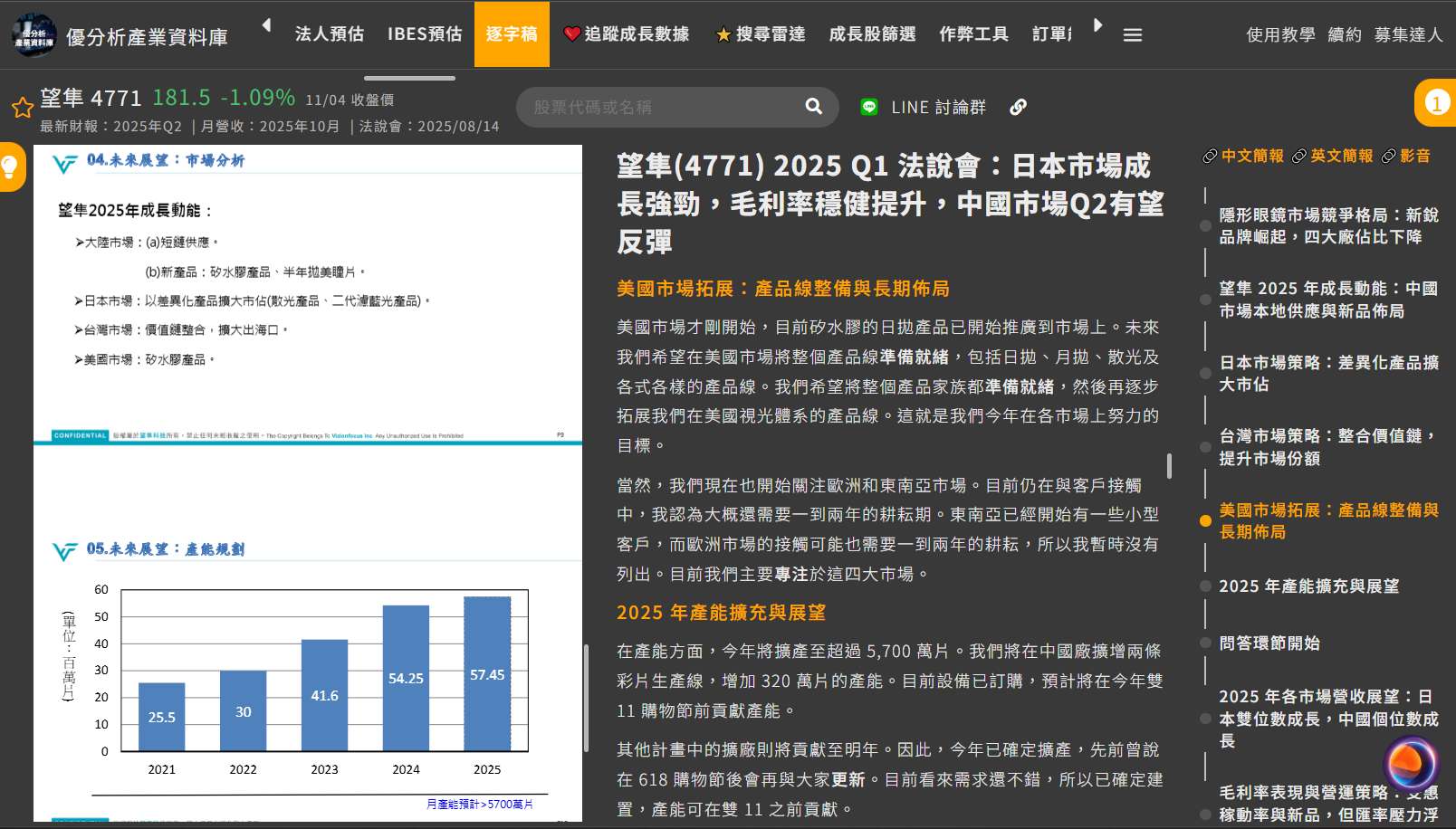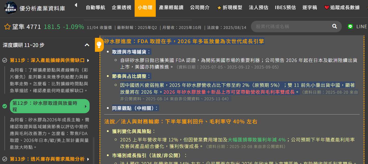 公司強調,日本市場雖競爭激烈,但消費者對高階與差異化產品接受度高,因此將持續以高附加價值產品搶攻中高階市場。由於日本客戶端多屬大型眼鏡連鎖與專業視光體系,公司產品通過認證後可迅速放量,有助提升整體毛利率表現。