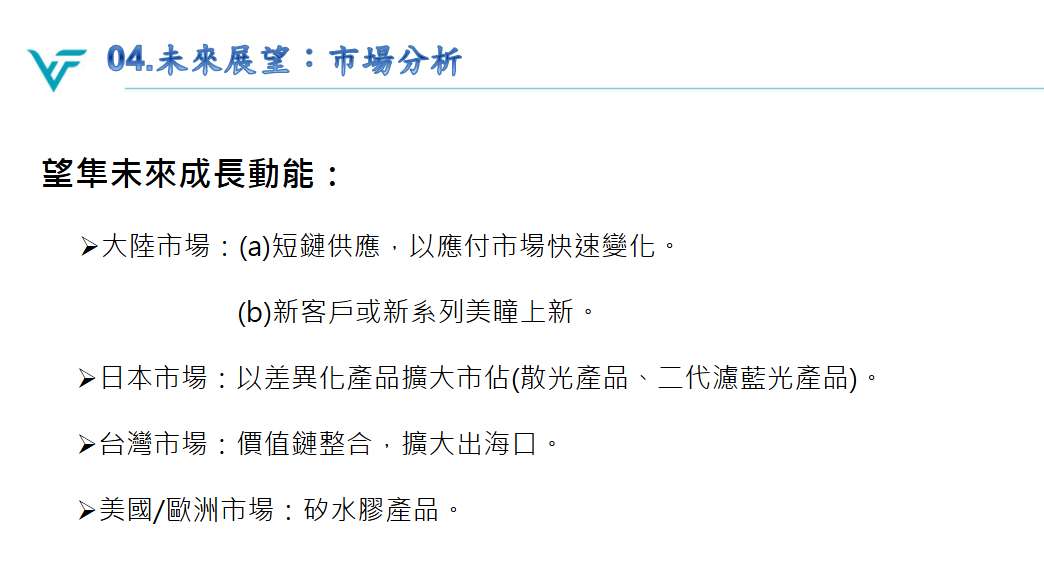 此外,其他規劃中的擴廠案則預定於明年陸續開出,有望進一步強化彩片與矽水膠產品供應能力。