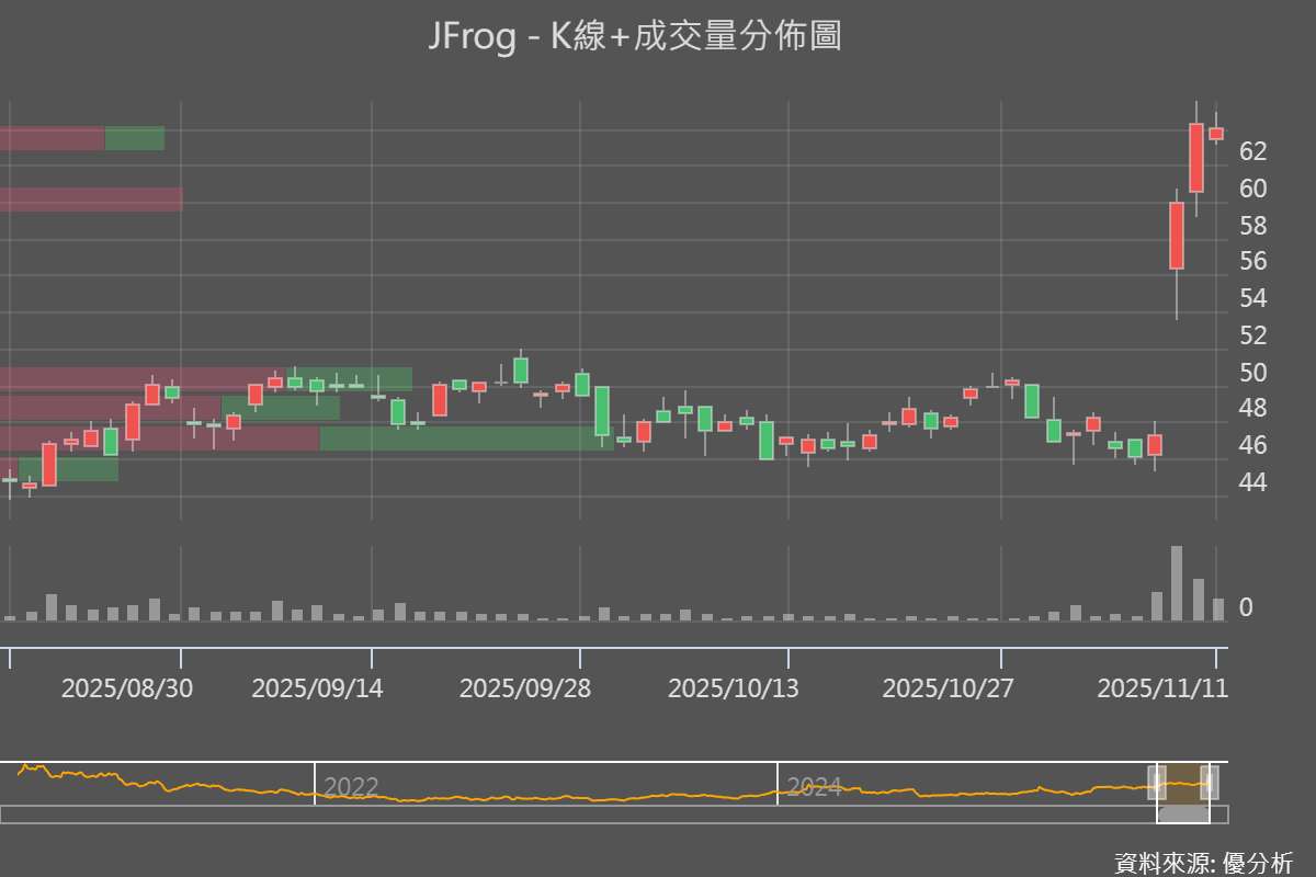 2025年11月12日(優分析/產業數據中心報導)⸺ JFrog(FROG-US)股價在公布第三季財報後飆漲,主因是雲端營收成長強勁、企業級訂閱擴張、AI整合產品受市場認可。市場看好公司在雲端業務與AI整合產品的推進,全年營運展望同步上修。