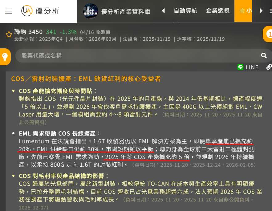 2026年04月16日(優分析/產業數據中心報導)⸺ AI資料中心大量擴建的現在,光通訊的規格以及需求數量也隨之升級,聯鈞(3450-TW)以 AOC(主動式光纖)與 COS(雷射晶片封裝) 為雙引擎,同步受惠於 800G 世代放量與高階雷射封裝供不應求的結構性趨勢。