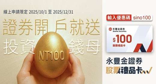 還沒開戶嗎?現在只要在永豐金證券線上開戶成功,就能領到 NT$100 股票禮品卡