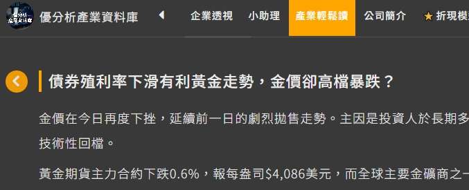 優分析用戶可直接點擊連結,參考這篇最新發布的:債券殖利率下滑有利黃金走勢,金價卻高檔暴跌?