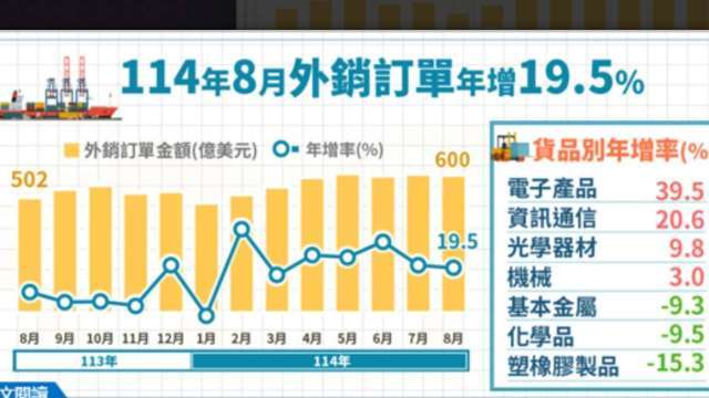 在人工智慧、高效能運算與雲端產業需求持續推升下,經濟部統計處今 (23) 日公布,台灣 8 月外銷訂單達 600.2 億美元,年增 19.5%,創下今年單月第二高紀錄,且是自今年二月以來連七個月的雙位數成長。其中,電子產品外銷表現最亮眼,年增近 4 成,輸美訂單更暴增 65.5%,顯示新興科技應用正強力帶動我國出口動能。