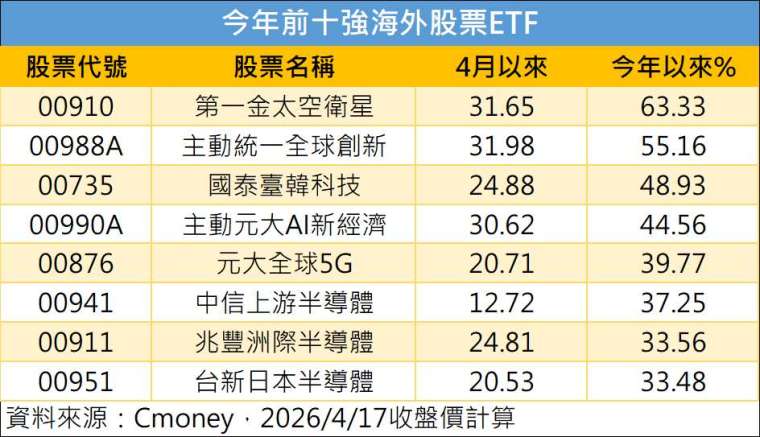 美伊暫時停火,金融市場經歷戰火後修復行情,以美股、韓股、台股為首持續上揚,年初以來多檔海外主動被動 ETF 漲勢犀利,依最新收盤價計算,表現最好的是第一金太空衛星 (00910-TW) 上漲 63.33%,其餘依序為主動統一全創新 (00988A-TW) 漲 55.16%、國泰臺韓科技 (00735-TW) 漲 48.93%,及主動元大 AI 新經濟 (00990A-TW) 漲 44.56% 等 4 檔海外股票 ETF,漲幅在四成至六成附近。